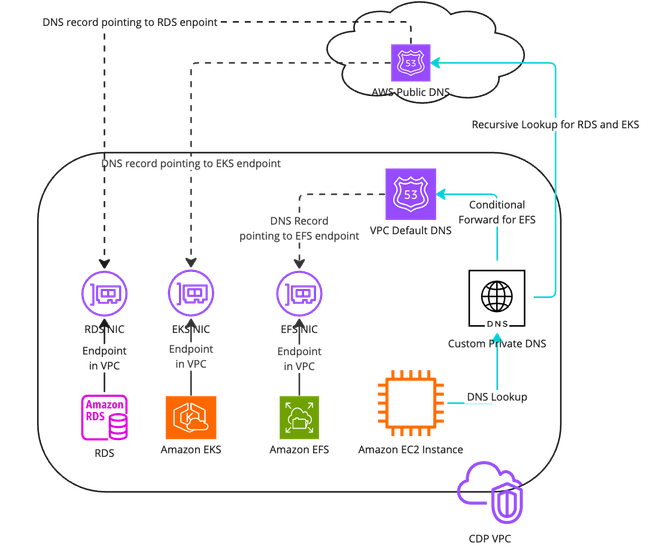 Sometimes, we can convince the network team to use AWS VPC default DNS, but that will introduce another dilemma that the resources in CDP VPC will not be able to resolve the other resources in the custom private domain.