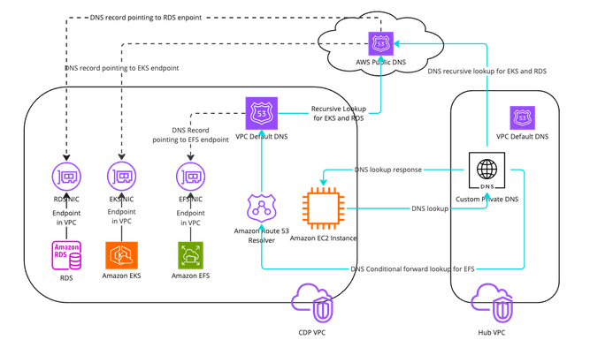 Recursive lookup for RDS and EKS is DNS native feature, and custom private DNS will recursively lookup the DNS record and come back from AWS public DNS. But because the EFS DNS record is in VPC Default DNS, it can’t be recursively looked up. Users will need to manually configure conditional forward from the custom private DNS to the EFS endpoint.