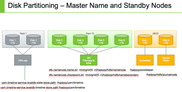 I am working on the requirements for my prod cluster. Question for you... Based on my somewhat novice knowledge, it seems like overkill to use RAID-10 and 4 1TB drives for the HA NNs when you are running QJM (which I assume is the case as the diagram also shows ZKs and JNs). All the edits go to the JN JBOD disks. So, that just leaves a couple fsimage files for the RAID-10 arrangement against 1TB - isn't that a bit over kill on storage?. Another confusion point for me is in that the NN disk layout diagram above it shows fsimage and edits going to the RAID-10 disks. Edits are written to the JNs against the one JBOD disk, right? So, is the diagram misleading or am I missing some intended message there? Here's a question I just asked related to this comment.