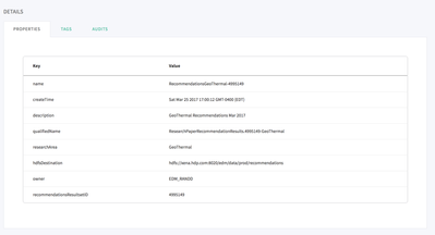 {"requestId":"qtp84739718-16 - b7ebe7d8-e671-4e94-a6c7-506947c7d5e5","entities":{"created":["43b6da13-31ee-4bbe-980e-84ed4b759f11"]},"definition":{"jsonClass":"org.apache.atlas.typesystem.json.InstanceSerialization$_Reference","id":{"jsonClass":"org.apache.atlas.typesystem.json.InstanceSerialization$_Id","id":"43b6da13-31ee-4bbe-980e-84ed4b759f11","version":0,"typeName":"ResearchPaperRecommendationResults","state":"ACTIVE"},"typeName":"ResearchPaperRecommendationResults","values":{"name":"RecommendationsGeoThermal-4995149","createTime":"2017-03-25T21:00:12.000Z","description":"GeoThermal Recommendations Mar 2017","qualifiedName":"ResearchPaperRecommendationResults.4995149-GeoThermal","researchArea":"GeoThermal","hdfsDestination":"hdfs:\/\/xena.hdp.com:8020\/edm\/data\/prod\/recommendations","owner":"EDM_RANDD","recommendationsResultsetID":4995149},"traitNames":[],"traits":{}}}
