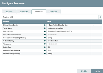 Finally we use the PutHBaseJson processor we ingest the data to the destination HBase Table created above. Notice that I am trying to randomly assign row identifier so that eventually I get multiple rows versions for the same identifier