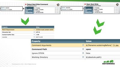 The below image shows the general setup; from top left we have a ListFile processor feeding a FetchFile processor to get the files into Nifi; we then use an UpdateAttribute processor and a SplitText processor to generate our sequenced lines of text; we then feed them into a ExecuteStreamCommand processor to run them through the 'Say' command which also acts as our blocking process to ensure serial execution; we then route the original lines out of that TextToSpeech processor into a RouteOnContent processor to recognise the command phrase 'Next Slide' which activates another ExecuteStreamCommand processor to open the appropriate slide image. Detailed configuration parameters in the linked images below, probably a bit easier to scroll through than pausing the video.