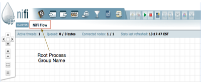 From there you are able to add additional process groups to that top-level canvas. These added process groups allow you drill down in to them giving additional blank canvases you could build dataflows on. When you enter a process group you will see the hierarchy represented just above the canvas in the UI ( NiFi Flow >> Process Group 1 ). NiFi does not restrict the number of process groups you can create or the depth you can go with them. You could compare the process group hierarchy to that of a Windows directory structure. So if you added another process group inside one that you already created, you would essentially now have gone two layers deep. ( NiFi Flow >> Process Group 1 >> Process Group 2 ). The hierarchy represented above you canvas allows you to quickly jump up one or more layers all the way to the root level by simply clicking on the name of the process group.