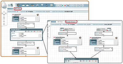 The purpose of this article is to explain what Process Groups and Remote Process Groups (RPGs) are and how input and output ports are used to move FlowFiles between them. Process groups are a valuable addition to any complex dataflow. They give DataFlow Managers (DFMs) the ability to group a set of processors on to their own imbedded canvas. Remote Process groups allow a DFM to treat another NiFi instance or cluster as just another process group in the larger dataflow picture. Simply being able to build flows on different canvases is nice, but what if I need to move NiFi FlowFiles between these canvases? This is where input and output ports come in to play. They allow you move FlowFiles between these canvases that are either local to a single NiFi or between the canvases of complete different NiFi instances/clusters.