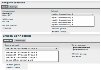 In the above example I have a small flow pushing FlowFiles into an embedded process group (Process Group 1) and also pulling data from the same embedded process group. As you can see, I have created an input and output port inside Process Group 1. This allowed me to draw a connection to and from the process group on the root canvas layer. You can have as many different input and output ports inside any process group as you like. When you draw the connection to a process group, you will be able to select which input port to send the FlowFiles to. When you draw a connection from a process group to another processor, you will be able to pick which output port to pull FlowFiles from.