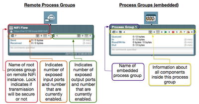 We refer to the ability to send FlowFiles between different NiFi instances as Site-to-Site. Site-to-Site is configured very much in the same way we just configured moving files between embedded process groups on a single NiFi instance. Instead of moving FlowFiles between different process groups (layers) within the same NiFi, we are moving FlowFiles between different NiFi instances or clusters. If a DFM reaches a point in their dataflow where they want to send data to another NiFi instance or cluster, they would add a Remote Process Group (RPG). These Remote Process Groups are not configured with unique system port numbers, but instead all utilize the same Site-to-Site port number configured in your nifi.properties files. I will not be covering the specific NiFi configuration needed to enable site-to-site in this article. For information on how to enable and configure Site-to-Site on a NiFi instance, see the Site-to-Site Properties section of the Admin Guide. Lets take a quick look at how these two components differ: