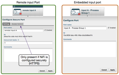If your NiFi has been configured to be secure (HTTPS) using server certificates, the remote input/output port’s configuration windows will have an “Access Control” tab where you must authorize which remote NiFI systems are allowed to see and access these ports. If not running secure, all remote ports are exposed and accessible by any other NiFi instance.