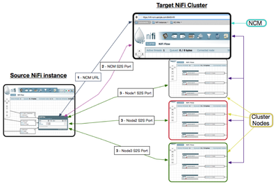 When sending data between two standalone NiFi instance the setup of your RPG is fairly straight forward. When adding the RPG, simply provide the URL for the target instance. The source RPG will communicate with the URL to get the Site-to-Site port to use for FlowFile transfer. When sending FlowFiles via Site-to-Site to a NiFi that is a NiFi cluster we want the data going to every node in the cluster. The Site-to-Site protocol handles this for you with some additional load-balancing benefits built in. The RPG is added and configured to point at the URL of the NCM. (1)The NCM will respond with the Site-to-Site port for the NCM. (2) The source will connect to the Site-to-Site port of the NCM which will respond to the source NiFi with the URLs, Site-to-Site port numbers, and current loads on every connected node. (3) The source NiFi will then load-balance FlowFile delivery to each of those nodes giving fewer FlowFiles to nodes that are under heavier load. The following diagram illustrates these three steps: