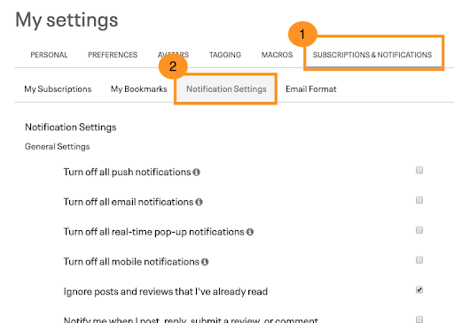 • Update Your Notification Preferences - Take a minute to set your preferences and ensure you’re subscribing to posts that match your interests. Click your avatar to get to My Settings > Subscriptions & Notifications > Notification Settings. You’ll receive an immediate email notification for your content subscriptions by default. You can change the frequency to: never, daily, or weekly. For more, see our Profile Tips.