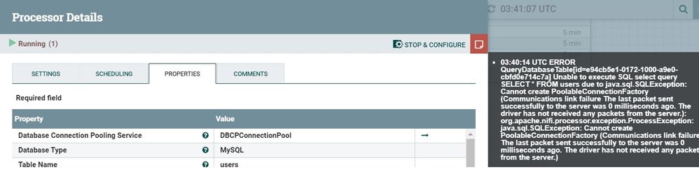 I am having issues while connecting to mysql database using apache nifi. The error is as follows