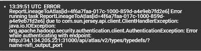 The error I receive while the "ReportLineageToAtlas" is running is about Authentication to Atlas to reach the API :
