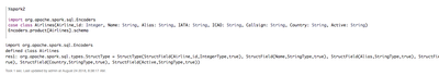 import org.apache.spark.sql.Encoders case class Airlines(Airline_id: Integer, Name: String, Alias: String, IATA: String, ICAO: String, Callsign: String, Country: String, Active: String) Encoders.product[Airlines].schema