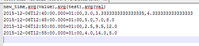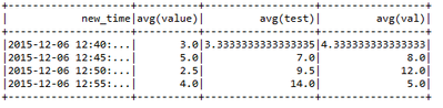 df.columns.map { c =>df.withColumn(c, col(c).cast("int"))}//add a new column inluding the new timestamp columnval result2=df.withColumn("new_time",((unix_timestamp(col("time"))/300).cast("long")*300).cast("timestamp")).drop("time")val finalresult=result2.groupBy("new_time").agg(result2.drop("new_time").columns.map((_ ->"mean")).toMap).sort("new_time")//agg(avg(all columns..) finalresult.coalesce(1).write.option("header",true).option("inferSchema","true").csv("C:/mydata.csv")